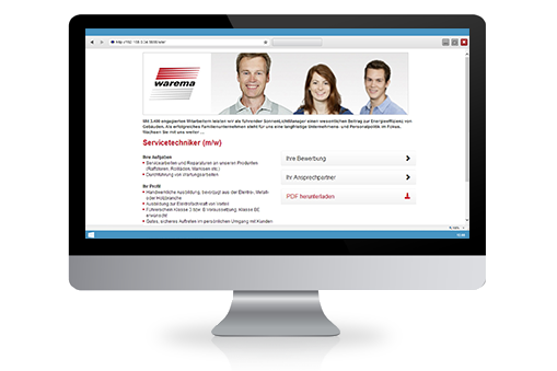 „Durch die neu entwickelte Applikation wird der Aufwand zur Einstellung neuer Stellen auf unserer Website deutlich vereinfacht. Die strukturierte Führung durch das Menü mit den vorgegebenen Feldern führt dazu, dass auch Kollegen, die diese Aufgabe seltener durchführen, fehlerfrei arbeiten können. Gleichzeitig wird durch die festgelegten Bild- und Textfelder ermöglicht, dass CD-Vorgaben immer eingehalten werden“, sagt WAREMA- Personalreferentin Monika Lurz.